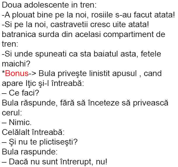 – Dupa ce imi citesc ziarul vreau sa ma culc, pana la 12 noaptea dorm cu sotia, dupa 12 noaptea dorm cu soacra.