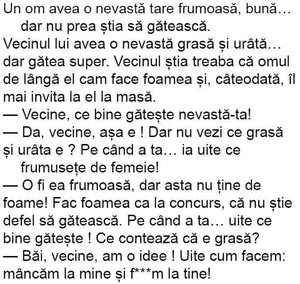 Un francez, un rus și un ardelean sunt prinși de canibali în jungla amazoniană. Înainte să-i mănânce, canibalii se oferă să le îndeplinească o ultimă dorință. Francezul cere o femeie, și după ce o primește este aruncat în oala uriașă de ciorbă a tribului. Rusul cere o votcă, și după ce o primește este aruncat alături de francez în aceeași oală. Ultima dorință a ardeleanului este ca fiecare canibal din trib să treacă pe rând să-l pălmuiască. Cu toate că li se pare ciudată dorința ardeleanului, canibalii trec pe rând și-l pălmuiesc. După ce-l pălmuiește și ultimul, ardeleanul scoate de sub haină o pușcă mitralieră și-i împușcă pe toți. Atunci, rusul scoate capul din oală și-l întreabă pe ardelean: