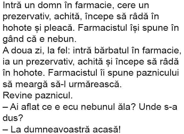 – Am cumpărat, dom’ doctor, dar n-am găsit borcan de zece litri și am luat două de cinci…