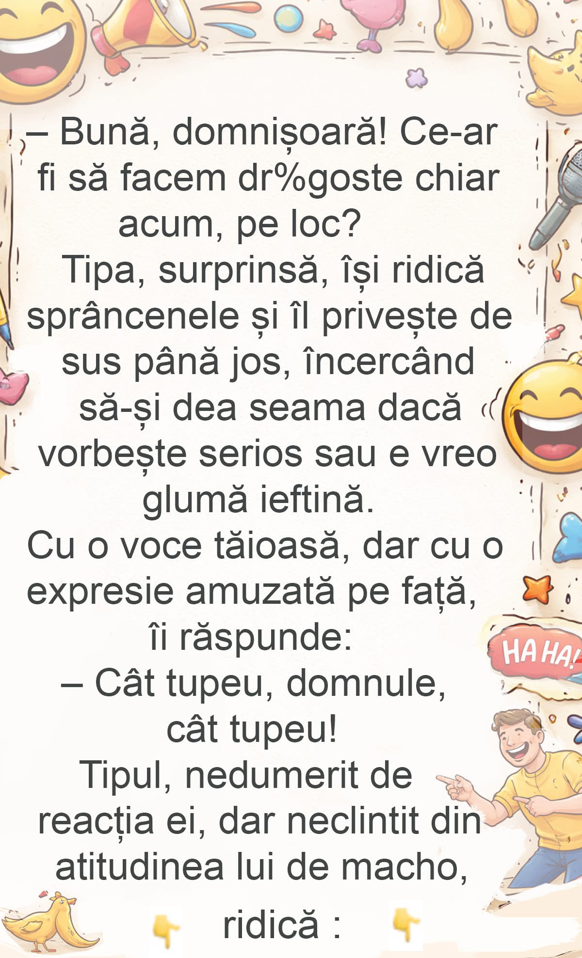 Se aşează rătăcitul la masă şi după ce termină aproape tot ce are în farfurie se adresează gazdei: - Pădurarule, pot să mai iau un pic de mămăligă? Uite, mi-a rămas un pic de brânză…