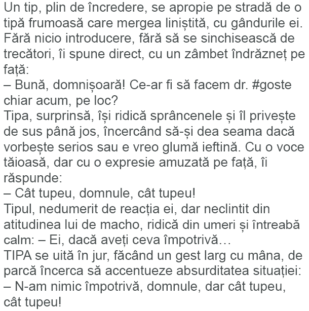 – Pai mi-am luat inima in dinti si am rugat-o sa iesim seara la o cina in oras si la ora 8 trebuia sa o iau de acasa.