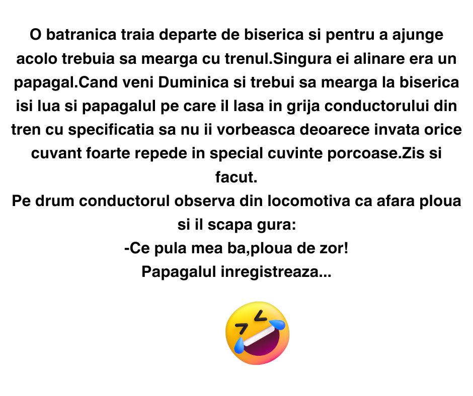 O batranica traia departe de biserica si pentru a ajunge acolo trebuia sa mearga cu trenul.Singura ei alinare era un papagal.Cand veni Duminica si trebui sa mearga la biserica isi lua si papagalul pe care il lasa in grija conductorului din tren cu specificatia sa nu ii vorbeasca deoarece invata orice cuvant foarte repede in special cuvinte porcoase.Zis si facut.
