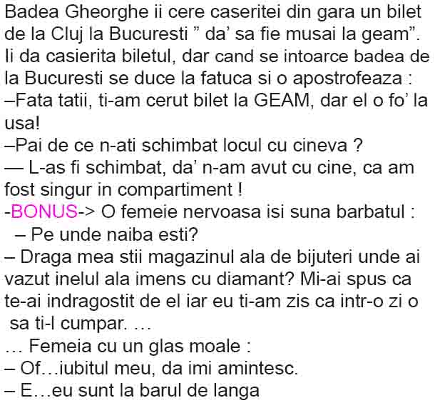 Bulă în mașină. La un moment îl depășește o găină. Apasă pe accelerator, n-o ajunge. După câțiva km ajunge la o fermă și-l întreabă pe țăran: