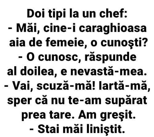 – O cunosc, raspunde al doilea, e nevasta-mea.