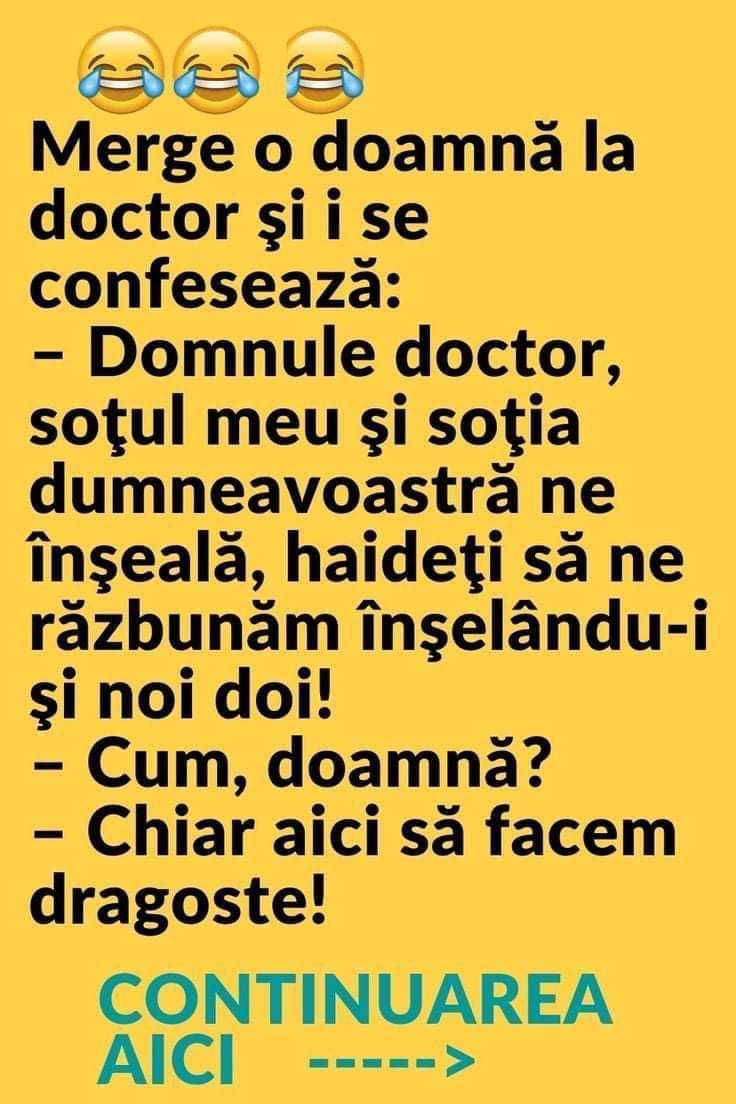 – Domnule doctor, soţul meu şi soţia dumneavoastră ne înşeală, haideţi să ne răzbunăm înşelându-i şi noi doi!