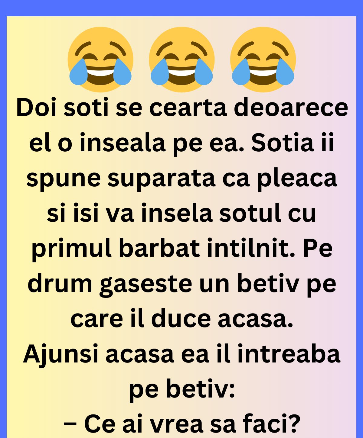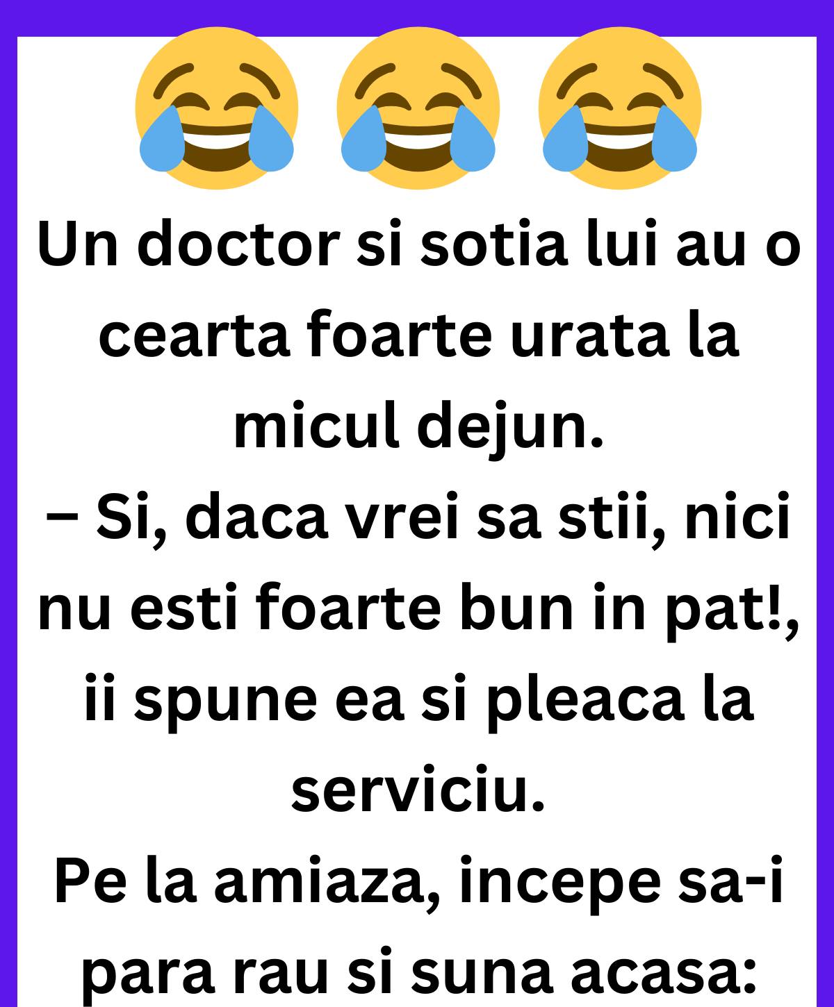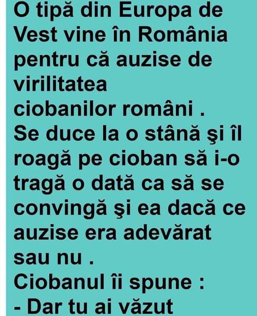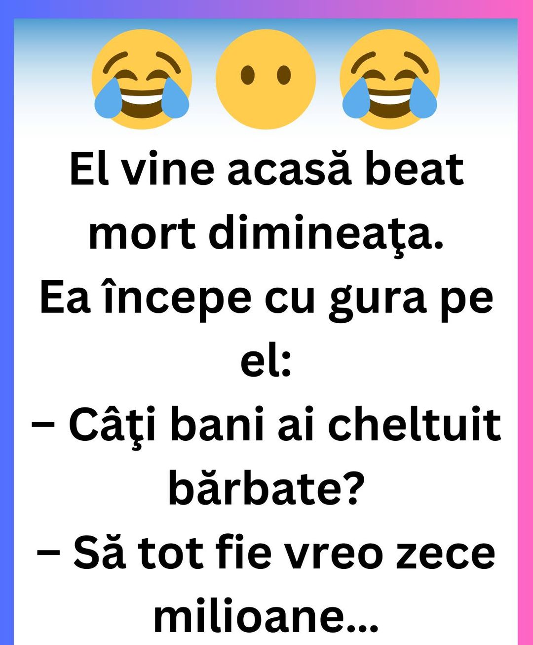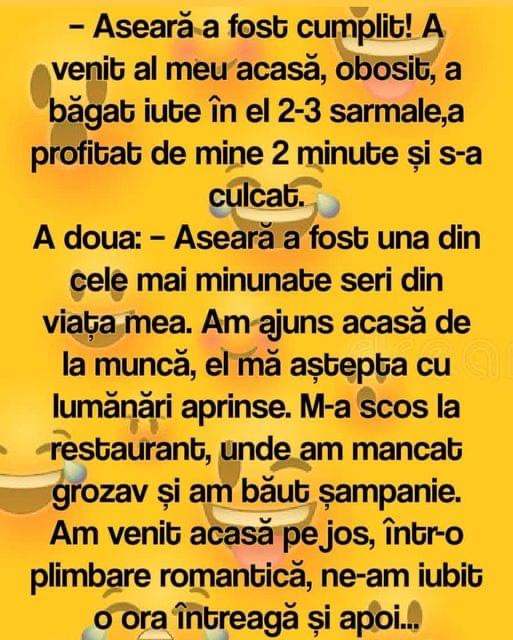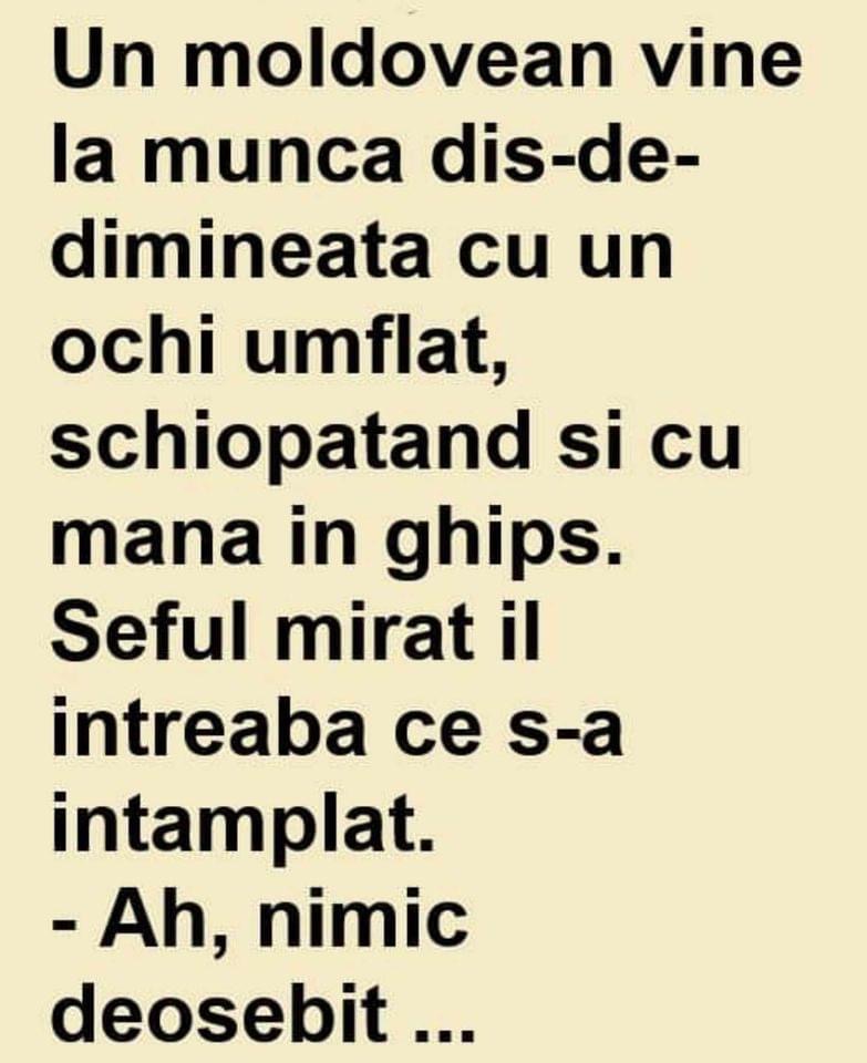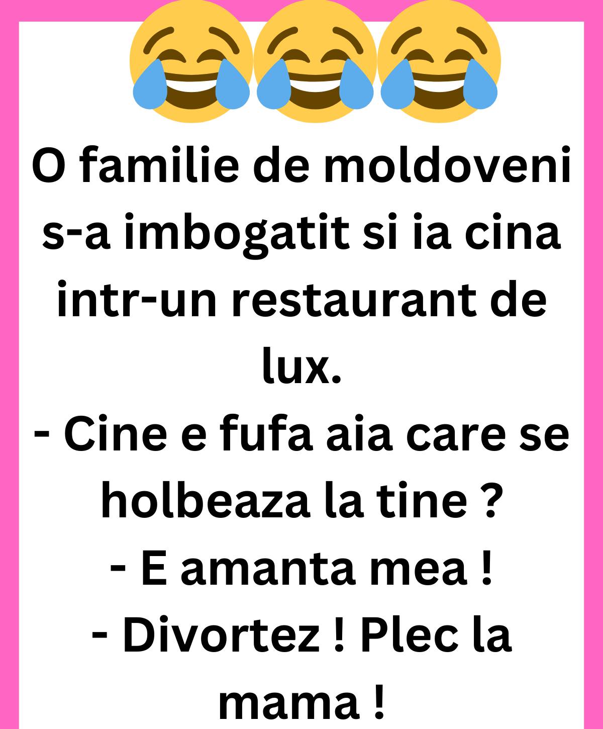 O familie de moldoveni s-a imbogatit si ia cina intr-un restaurant de lux.– Cine e fufa aia care se holbeaza la tine ?– E amanta mea !– Divortez ! Plec la mama !– Bine, dar sa stii ca dupa divort se vor termina vacantele in strainatate, shopping-ul la Milano, partidele de schi in Alpi si … Read more