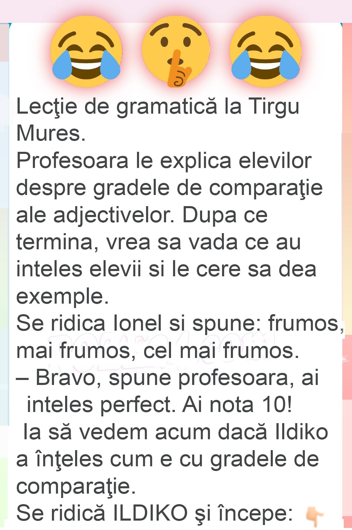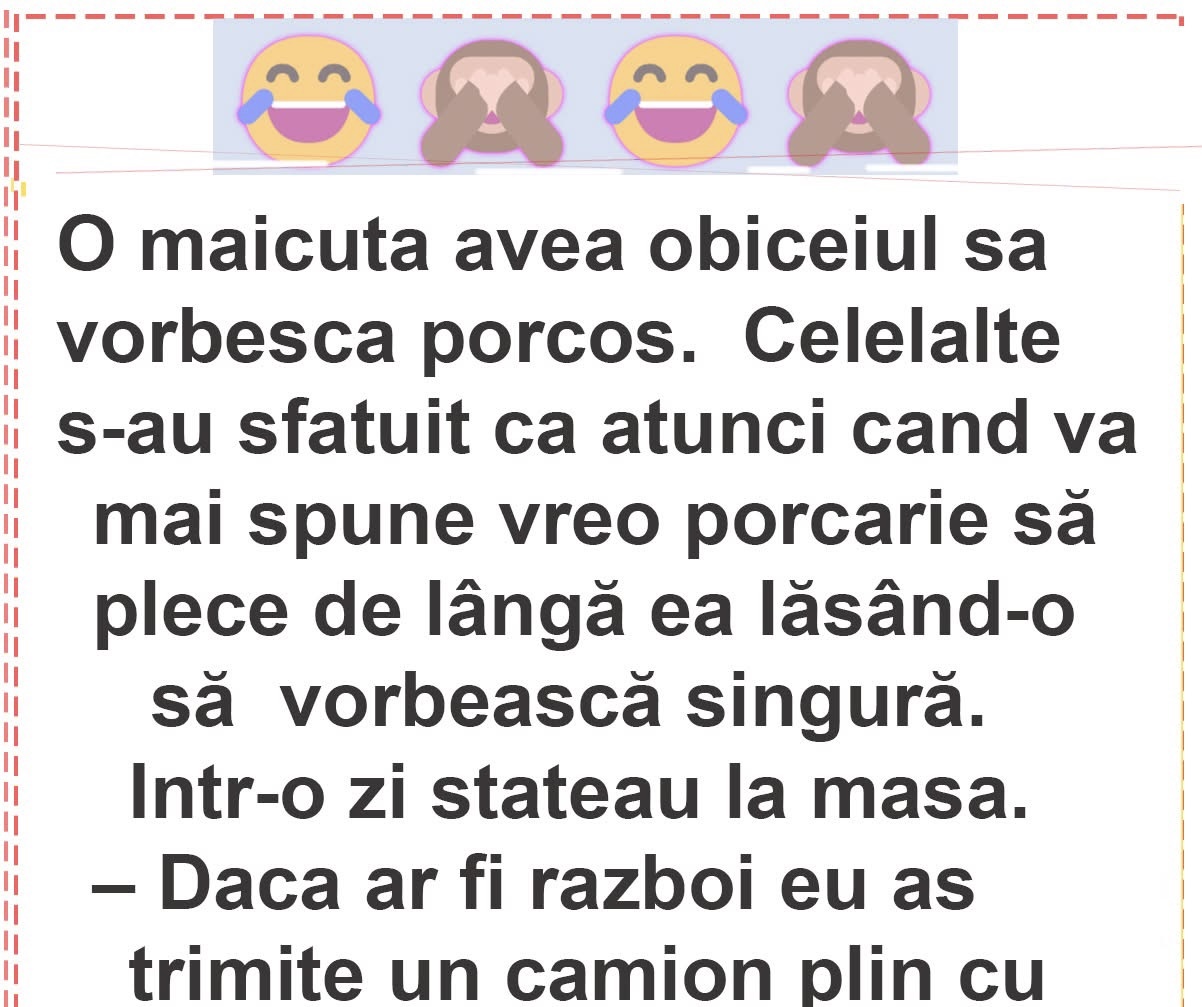 O maicuta avea obiceiul sa vorbesca porcos. Celelalte s-au sfatuit ca atunci cand va mai spune vreo porcarie sa plece de langa ea lasand-o savorbeasca singura.Intr-o zi stateau la masa. – Daca ar fi razboi eu as trimite un camion plin cualimente! – Daca ar fi razboi eu as trimite un camion plin cumedicamente! – … Read more