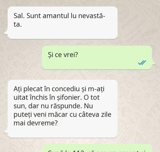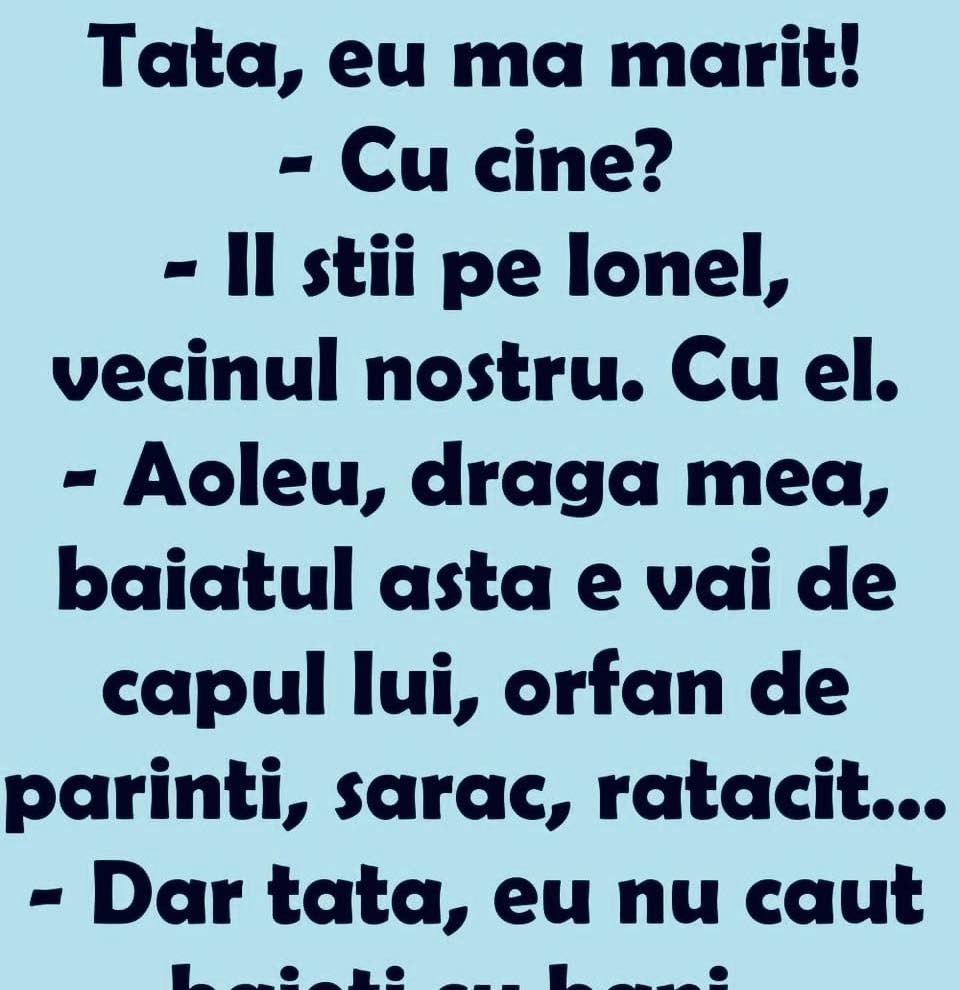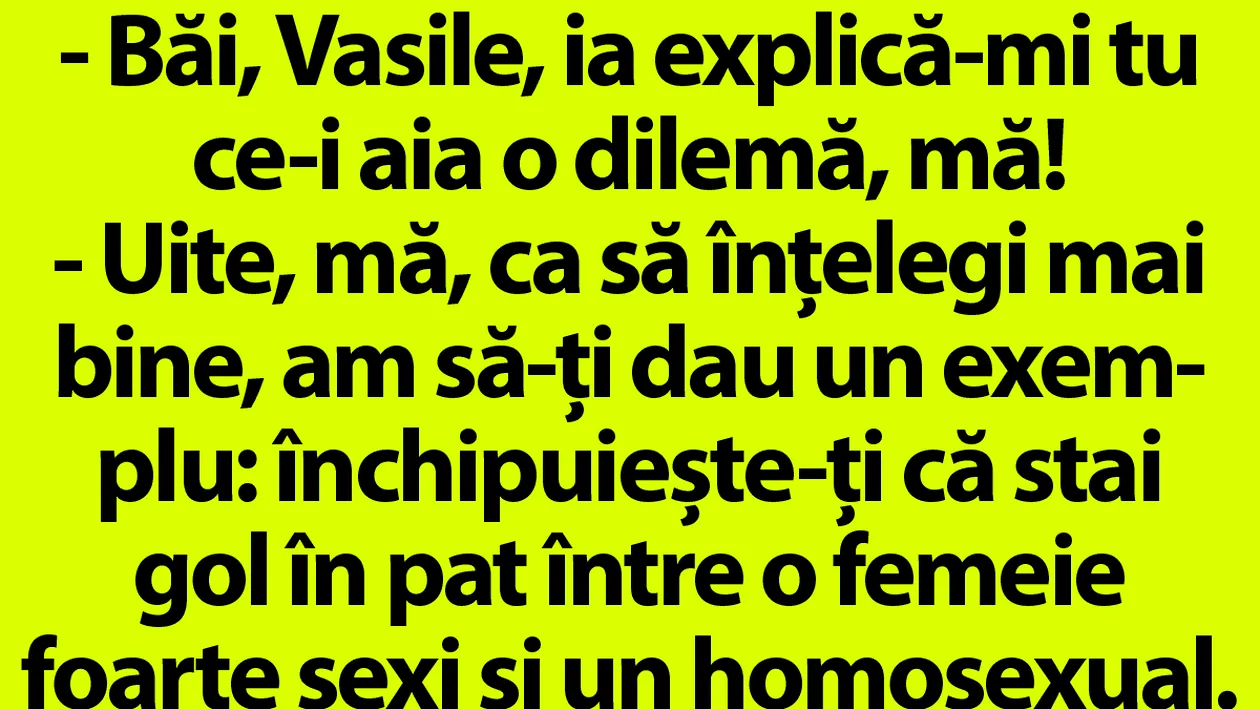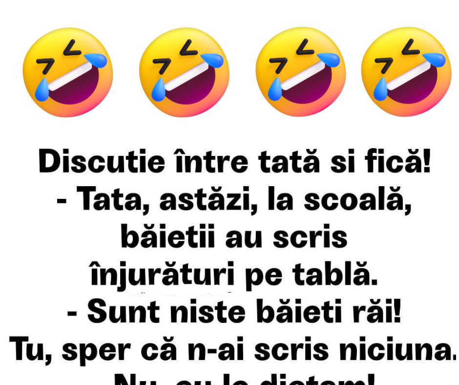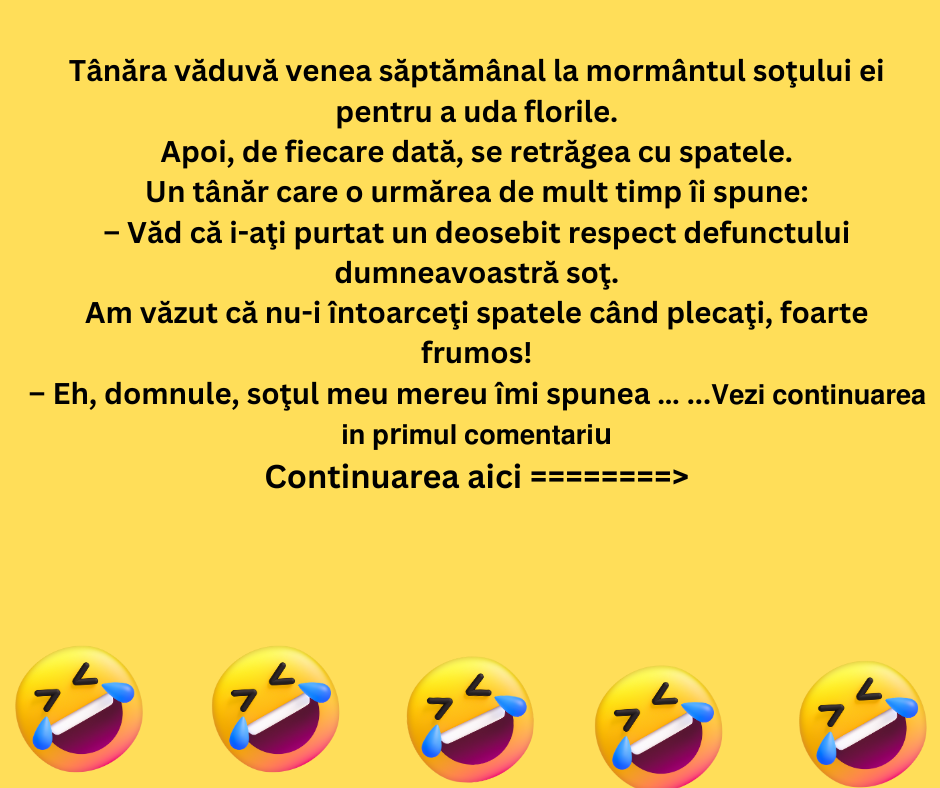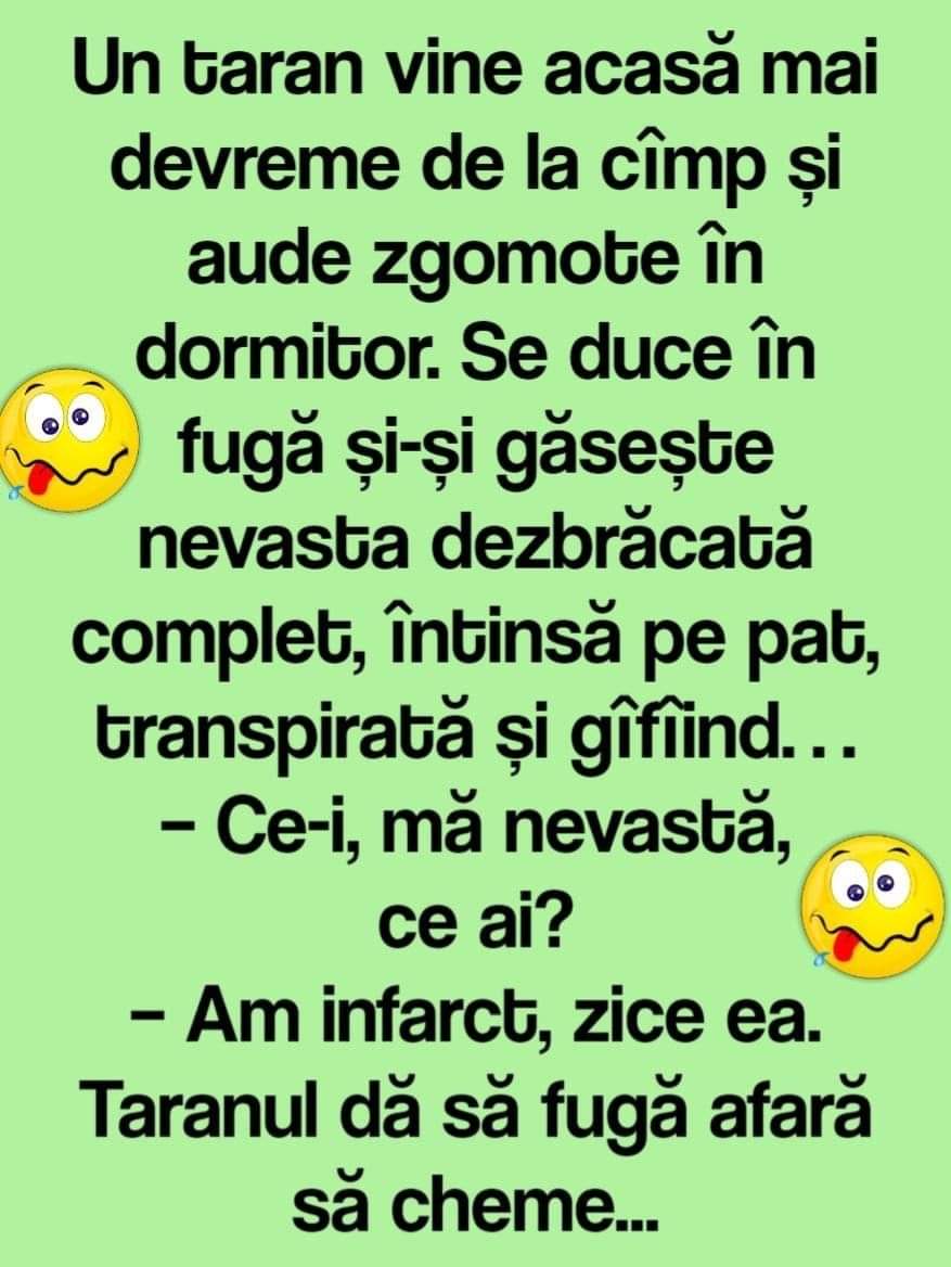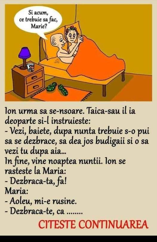 CITESTE ȘI URMATORUL BANC ⤵️ Soacra merge in vizita la nora ei si o gaseste pe pat. – Ce faci noro? Il astept pe sotul meu in costumul Evei, ca sa-i fac o surpriza placuta. Se duce soacra acasa si isi asteapta sotul goala, pe pat. – Ce faci, fa? – Te-astept in costumul Evei! … Read more