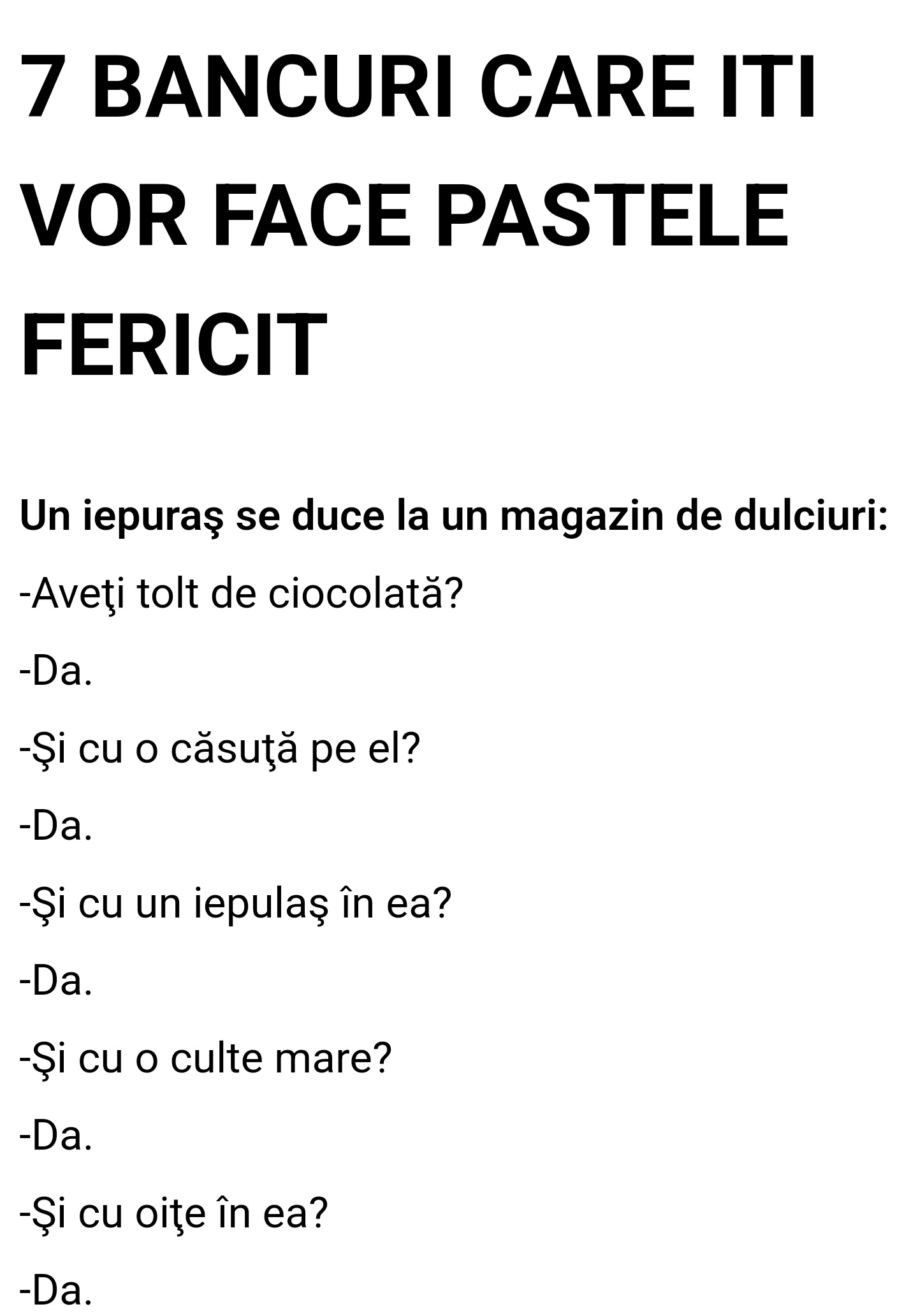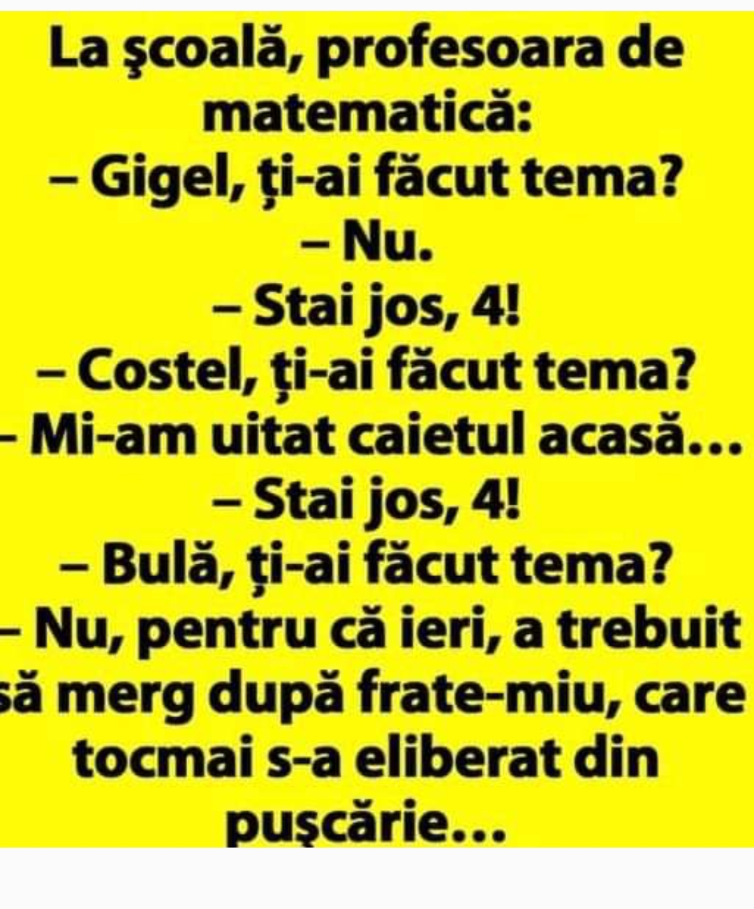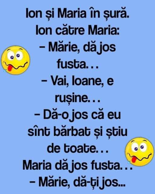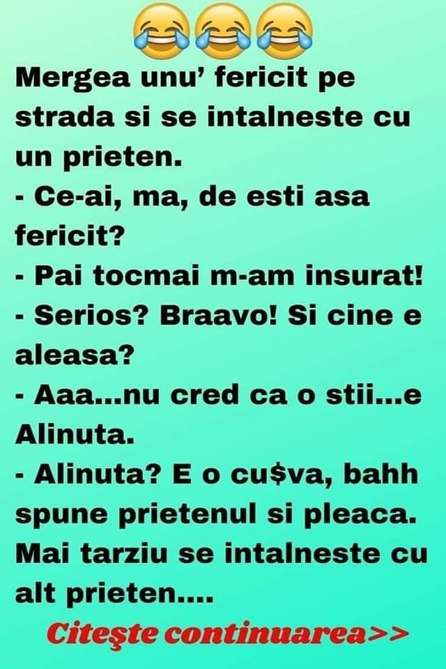 Mergea unu’ fericit pe strada si se intalneste cu un prieten.– Serios? Braavo! Si cine e aleasa?– Aaa…nu cred ca o stii…e Alinuta.– Alinuta?E o cu$va, bahh spune prietenul si pleaca.Mai tarziu se intalneste cu alt prieten.– Ce faci? intreaba prietenul– Foarte bine!– De ce?– Pai tocmai m-am insurat cu Alinuta.– Cu … aia, ma?De … Read more