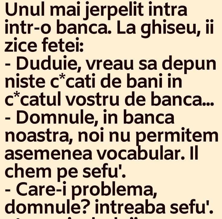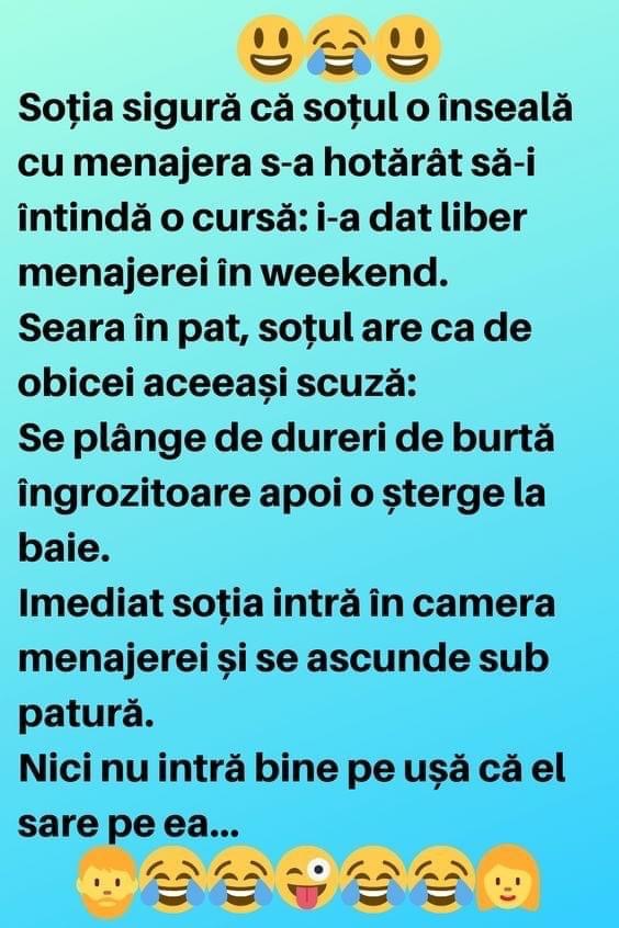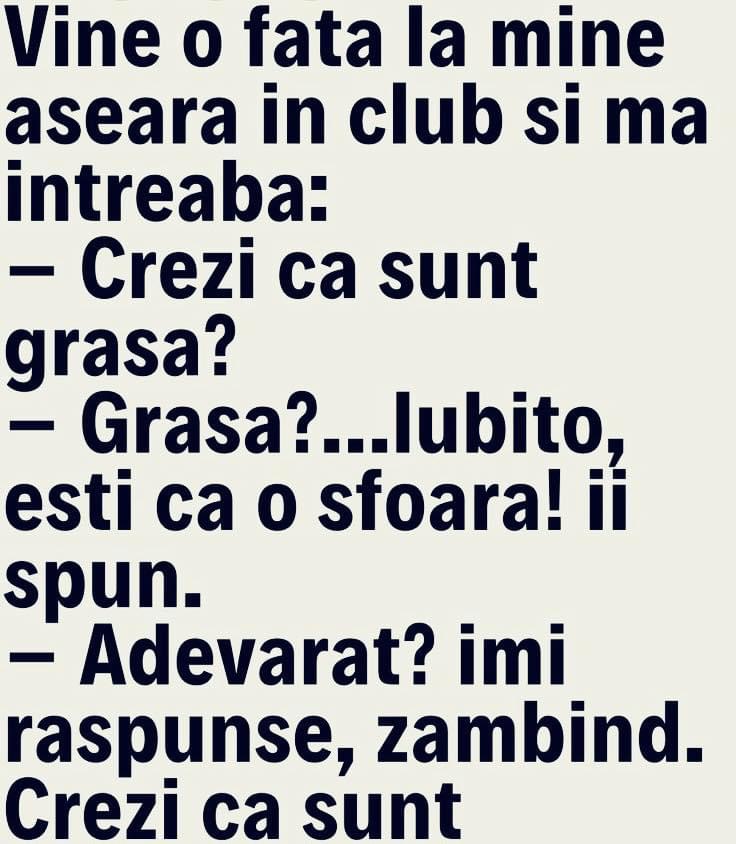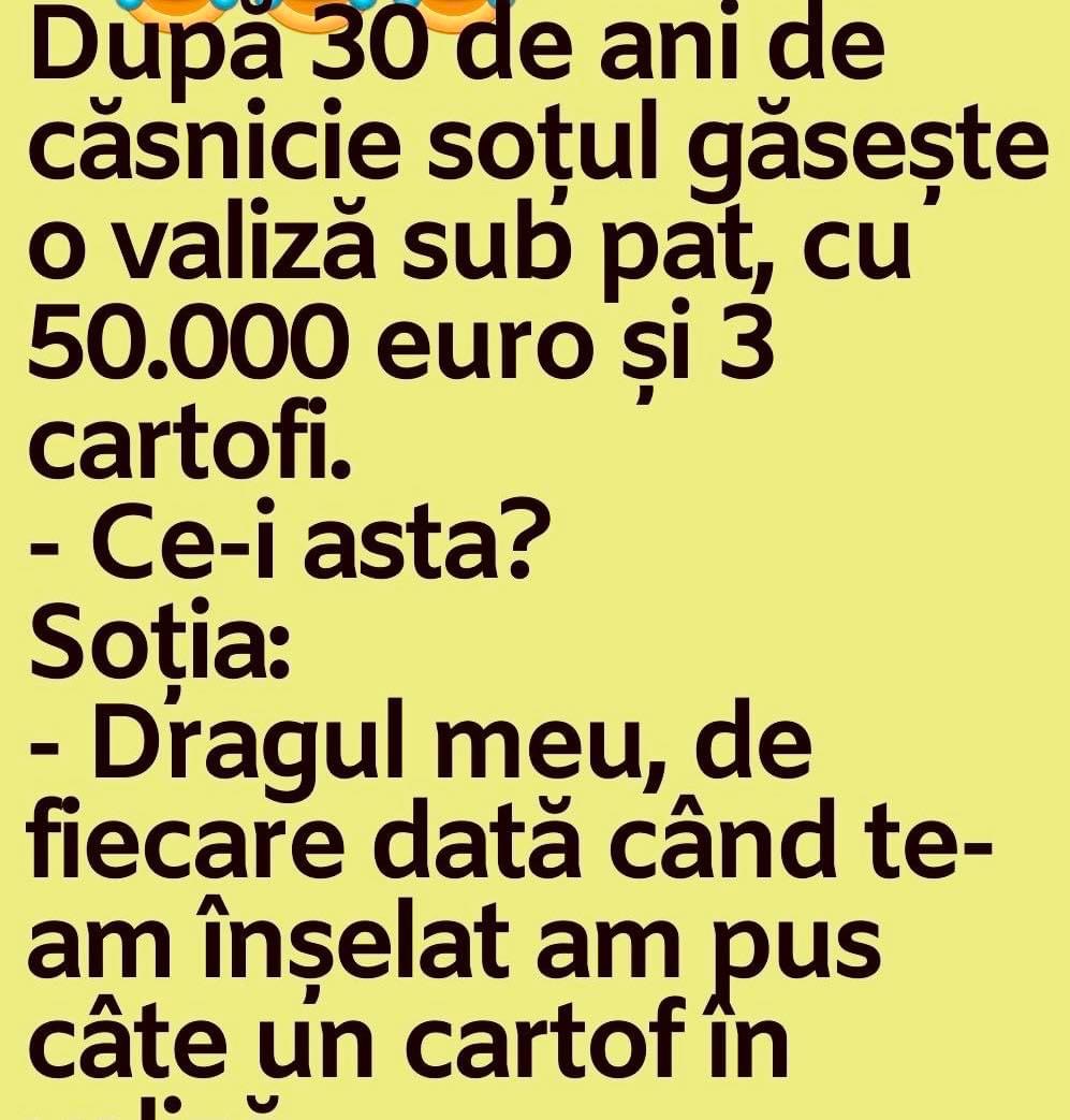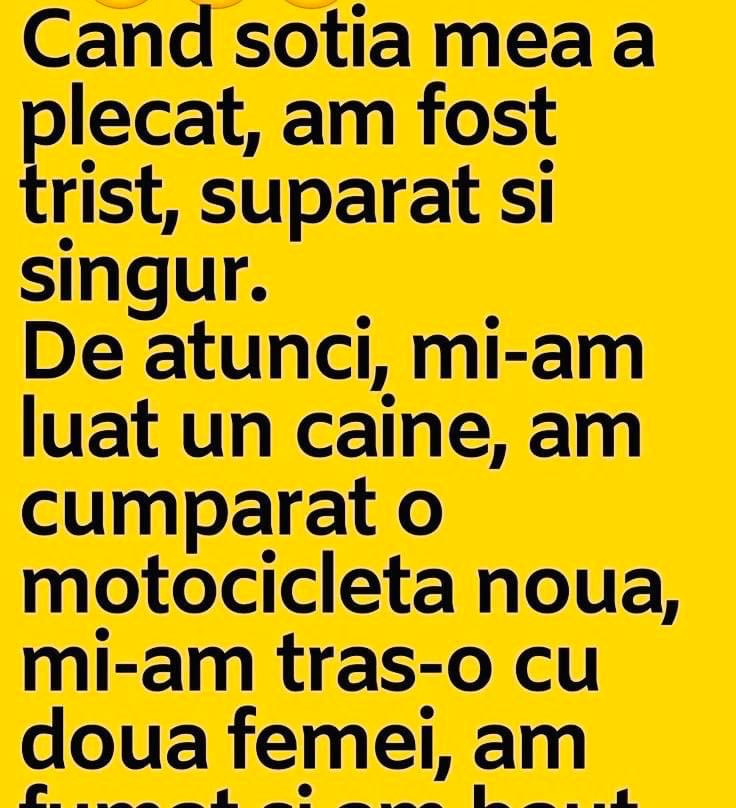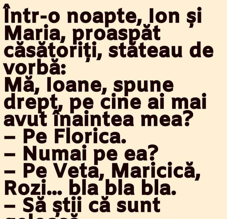 Un marinar daruieste sotiei, inainte de a pleca in cursa, pe mare, un vibrator:-Cu el n-o sa te mai simti singura!La intoarcere, il gaseste aruncat intr-un colt.-Nu ti-a placut cadoul meu?-Da’ de unde! Mi-a zburat toate plombele. Blonda și literaturaNumiți trei piese de William Shakespeare.La care blonda spune:– 10 cm , 15 cm , 20 … Read more