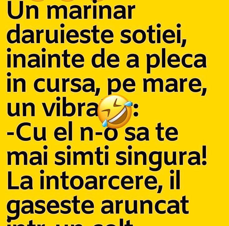 Un marinar daruieste sotiei, inainte de a pleca in cursa, pe mare, un vibrator:-Cu el n-o sa te mai simti singura!La intoarcere, il gaseste aruncat intr-un colt.-Nu ti-a placut cadoul meu?