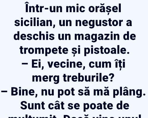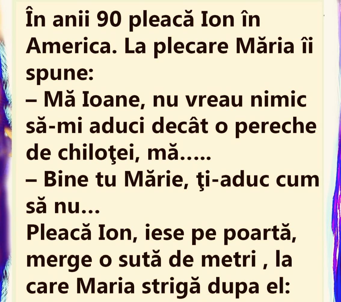 Prin anii 90, pleacă Ion în America. La plecare, Maria îi spune:Ma Ioane, nu vreau cine stie ce, doar sa-mi aduci o pereche de chilotei, ma…– Bine tu, Marie, ti-aduc, cum sa nu…Pleaca Ion, iese pe poarta, la care Maria striga dupa el:– Ma Ioane, si-o fundita de legat parul, ma!– Da tu, da!Ajunge Ion … Read more