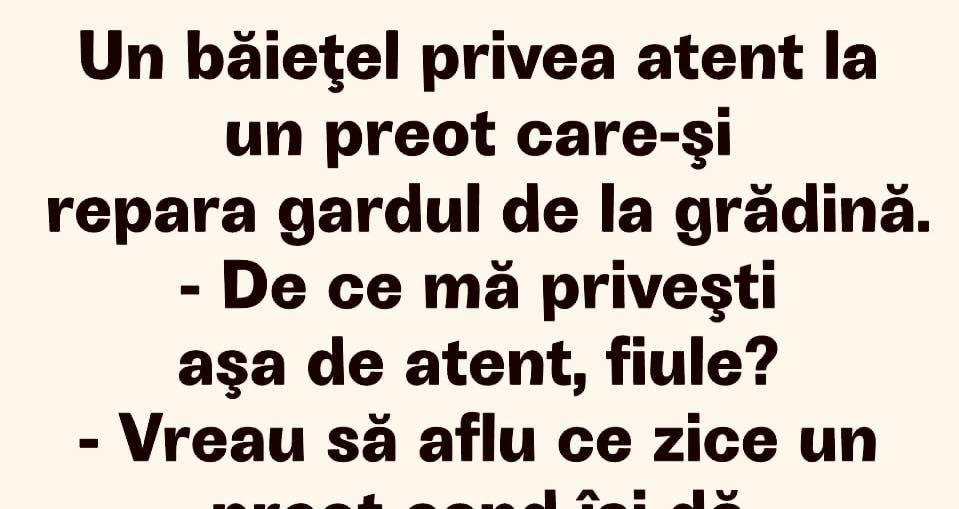 Un baietel privea atent la un preot care-si repara gardul de la gradina. De ce ma privesti asa de atent fiule? Vreau sa aflu ce zice un preot cand isi da..