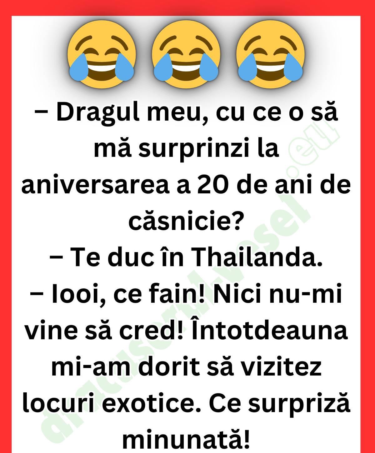 Dragul meu, cu ce o să mă surprinzi la aniversarea a 20 de ani de căsnicie? – Te duc în Thailanda. – Iooi, ce fain! Nici nu-mi vine să cred! Întotdeauna mi-am dorit să vizitez locuri exotice. Ce surpriză minunată! – Mă bucur că-ți place ideea, dragă. – Și la aniversarea de 30 de ani? … Read more