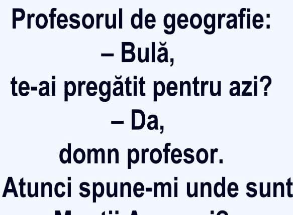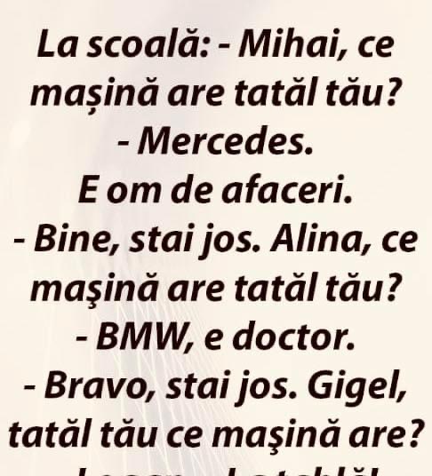Părinţii îşi ceartă copilul şi-l pedepsesc că a luat nota 4 la geografie.– Măi femeie, noi am certat copilul ăsta că n-a ştiut unde-i Marocul, dar noi ştim?– Nu ştim, dar nu poate fi departe. Am la serviciu un coleg din Maroc şi vine cu bicicleta… Doctore, uita-te la mine sa vezi ce am, ca … Read more