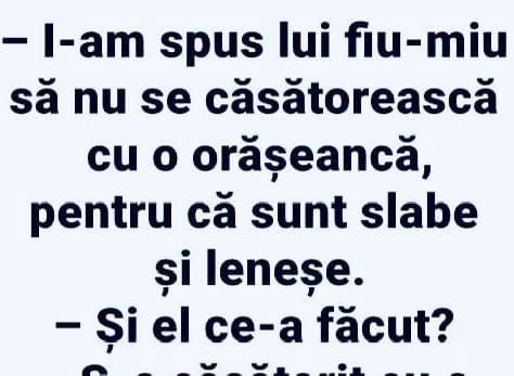 I-am spus lui fiu-miu sa nu se casatoreasca cu o oraseanca pentru ca sunt slabe si lenese..Si el ce-a facut??
