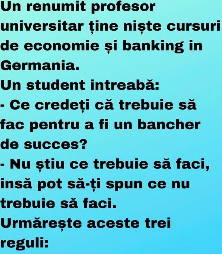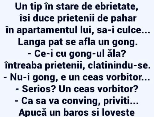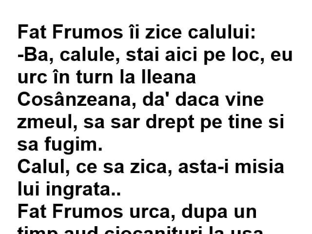 Fat Frumos îi zice calului:-Ba, calule, stai aici pe loc, eu urc în turn la Ileana Cosânzeana, da’ daca vine zmeul, sa sar drept pe tine si sa fugim.Calul, ce sa zica, asta-i misia lui ingrata.. Fat Frumos urca, dupa un timp aud ciocanituri la usa. Fat Frumos se azvârle pe fereastra.Ileana se aranjeaza, deschide, … Read more