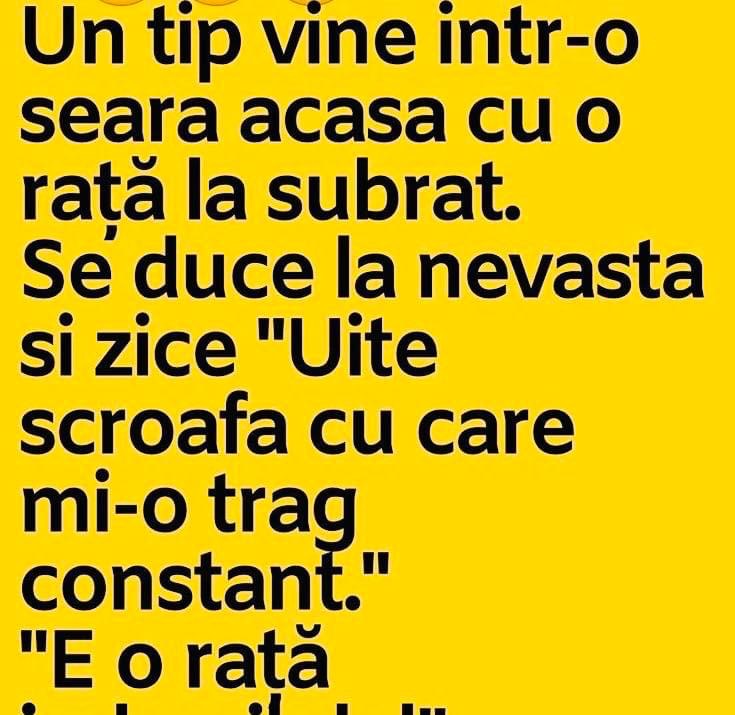 Un tip vine intr-o seara acasa cu o rață la subrat.Se duce la nevasta si zice “Uite scroafa cu care mi-o trag constant.”“E o rață imbecilule!”, raspunde ea.