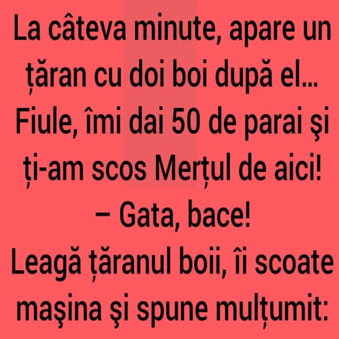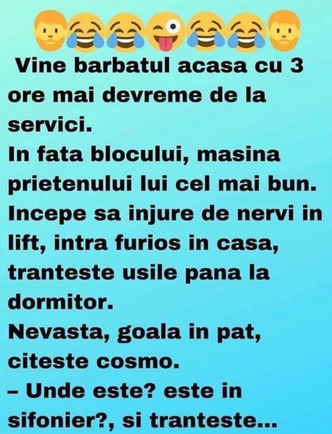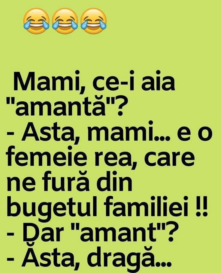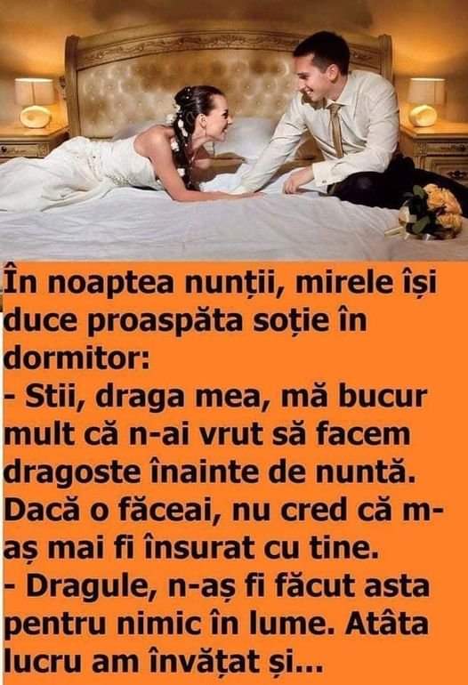 În noaptea nunții, mirele își duce proaspăta soție în dormitor: – Stii, draga mea, mă bucur mult că n-ai vrut să facem dragoste înainte de nuntă. Dacă o făceai, nu cred că m-aș mai fi însurat cu tine. – Dragule, n-aș fi făcut asta pentru nimic în lume. Atâta lucru am învățat și eu la … Read more