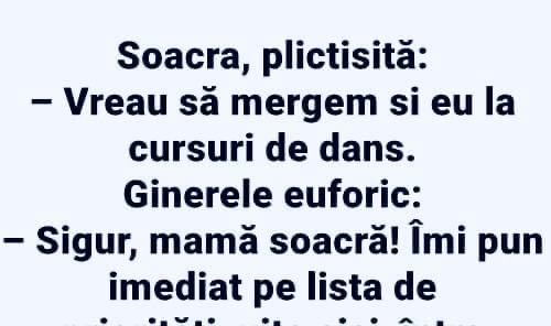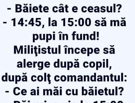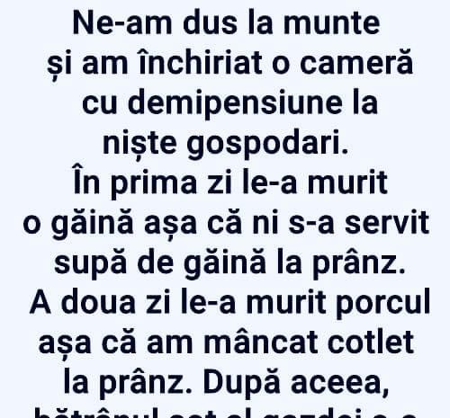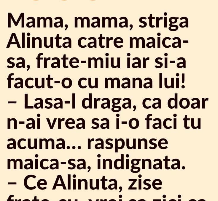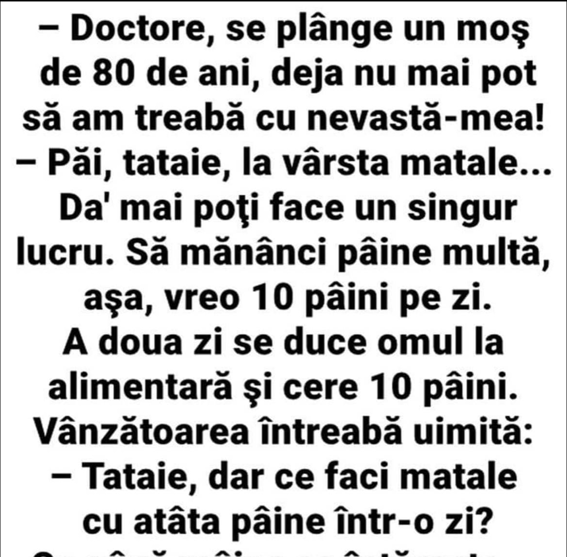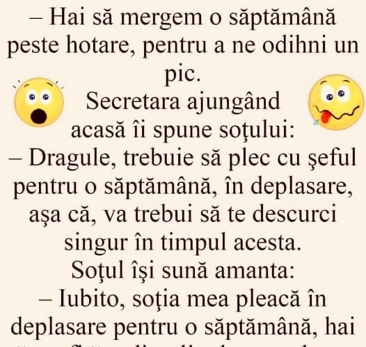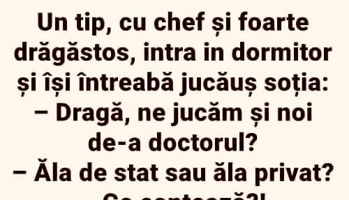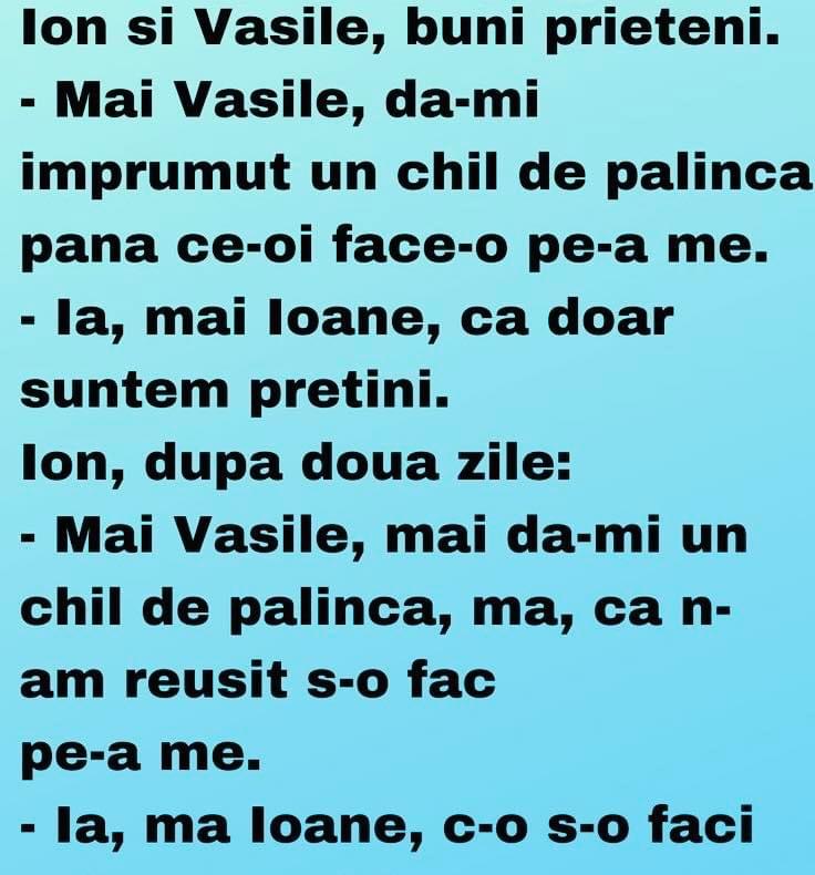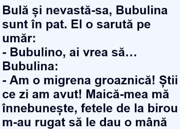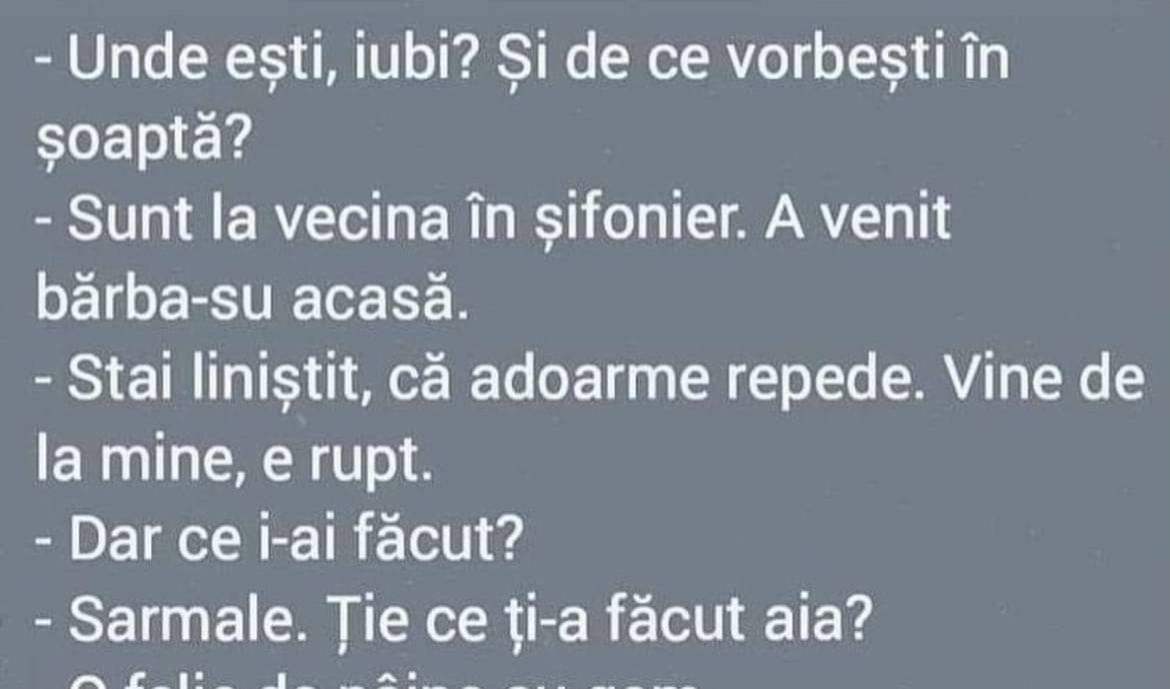 Unde ești, iubi? Și de ce vorbești în șoaptă? Sunt la vecina în șifonier. A venit bărba-su acasă. – Stai liniștit, că adoarme repede. Vine de la mine, e rupt. – Dar ce i-ai făcut? – Sarmale. Ție ce ți-a făcut aia? – O felie de pâine cu gem. – Ieși acum din șifonier și … Read more